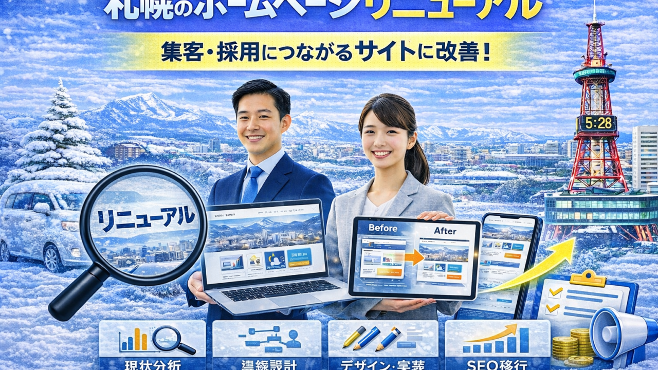 札幌のホームページリニューアルは、見た目を整えるだけでは成果が出ません。札幌の商圏と比較行動、生活圏の分断、冬季の行動変化を踏まえた導線設計と、SEO移行を含む技術設計、公開後に改善を回す運用が揃って初めて、問い合わせと採用につながるサイトになります。